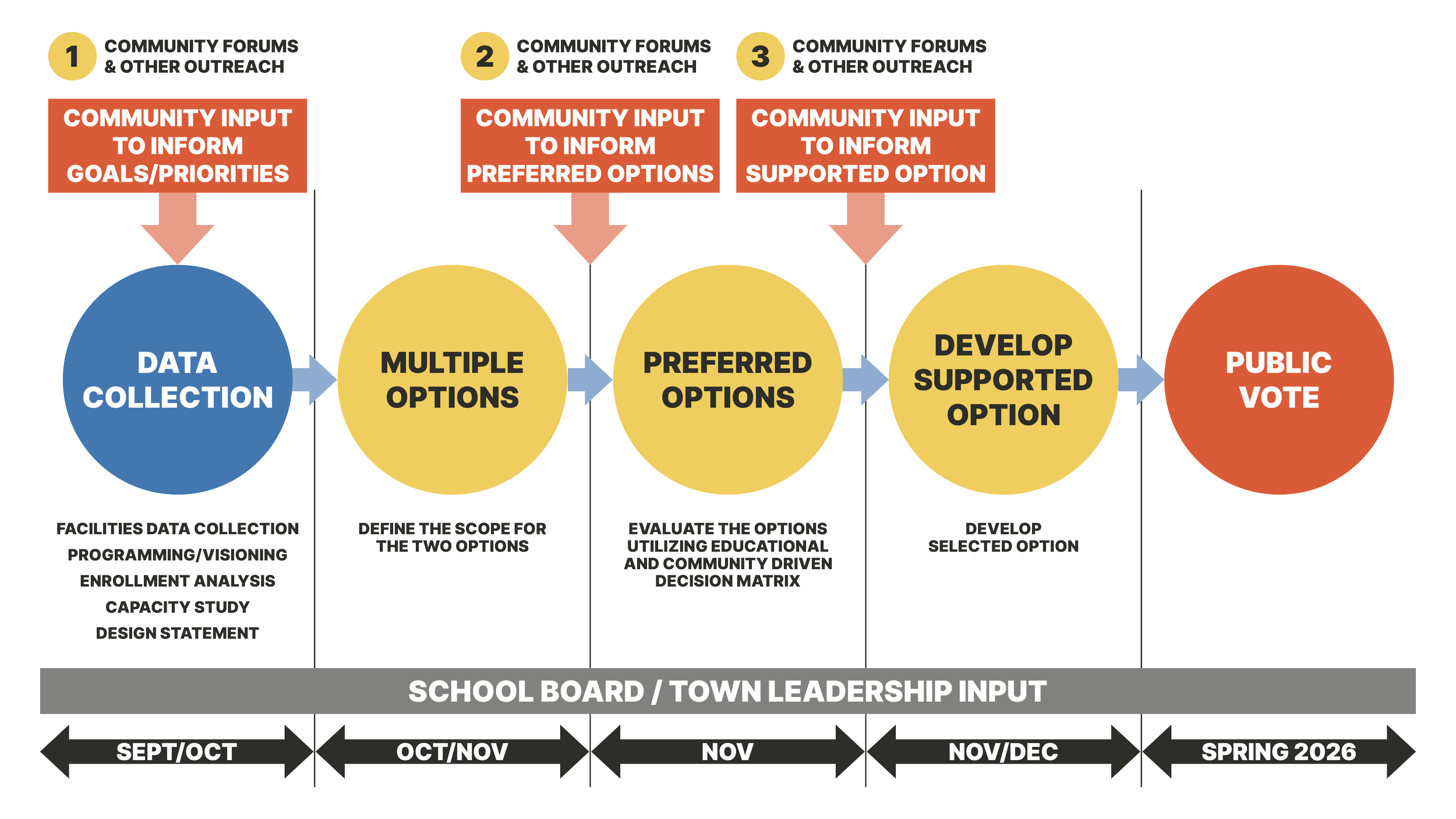 The FIC presented the findings of their Needs Assessment to the School Board, including the two options determined to move forward. It was determined that a consultant should be brought on via an RFP process by mid-October to target a March 2026 referendum.